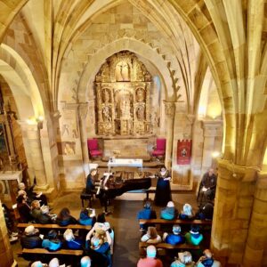 El concierto del 3 de mayo se celebró en la Iglesia de Santa María la Real, un edificio románico con espléndidas pinturas góticas y excelentes condiciones acústicas.. Los intérpretes fueron la soprano Sara Castrillo y el pianista Anselmo Bustamante, con el concierto «Canciones de mayo». Sara Castrillo ofreció al público un amplio y variado programa: música religiosa, antigua y moderna, romanzas de zarzuela, arias de ópera, música brasileña y norteamericana, canciones españolas… Fue una ocasión de apreciar el virtuosismo y el amplio registro de esta cantante, acompañada al piano por un músico lleno de experiencia y de gusto refinado como es Anselmo Bustamante. Puccini, Chueca, Mozart, Gerswhin, Bizet, Bach, Clara Schumann, Nicola Piovani, serán los autores de las obras interpretadas.