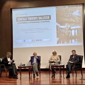 La mesa redonda, moderada por Carmen Becerra Suárez, contó con ponentes expertos en tres de las facetas literarias del escritor: su trabajo periodístico, su producción dramática y su escritura novelística. Se trata de Ana María Gómez-Elegido Centeno, profesora en la Universidad Complutense de Madrid y especialista en la labor periodística de Gonzalo Torrente Ballester; José Antonio Pérez Bowie, catedrático de Teoría de la Literatura y Literatura Comparada en la Universidad de Salamanca y experto en la escritura dramática del autor y Borja Rodríguez Gutiérrez, presidente de la Real Sociedad Menéndez Pelayo, doctor en Literatura Española y especialista en la faceta novelística de Torrente Ballester.