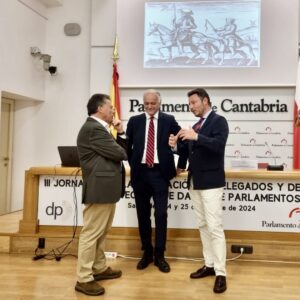Pie de foto: López Nevot, en el centro, antes del comienzo de la conferencia con el presidente de la SMP, Borja Rodríguez (izquierda) y el vicepresidente del Parlamento, Alejandro Liz Cacho.